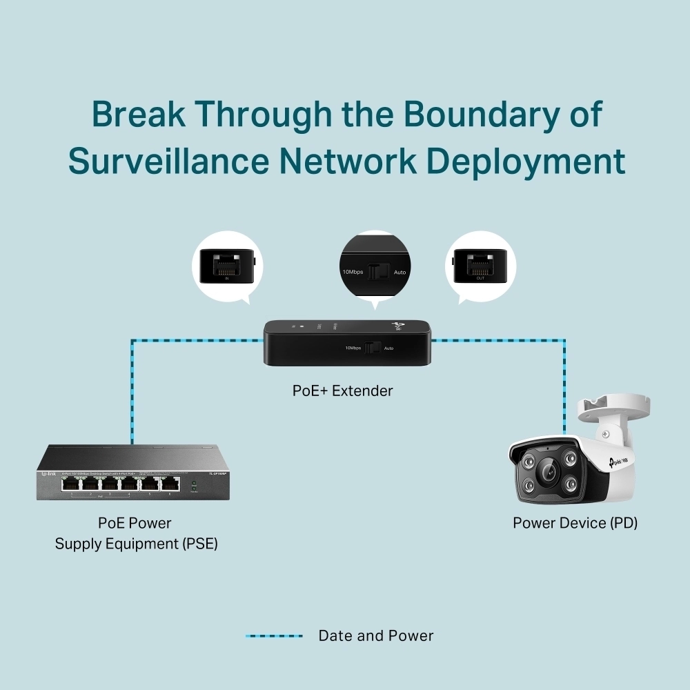 PoE+ удължител, 1 x 10/100Mbps RJ45 PoE IN port, 1 x 10/100Mbps RJ45 PoE Out port, поддържа до 20 W, до 250m 10Mbps, Plug-and-Play... виж повече