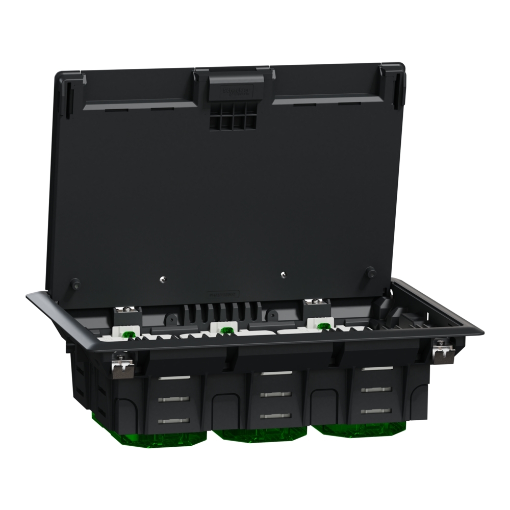 Подова кутия L 6M/45x45/пластмаса Антрацит Unica System+. Пълен комплект за монтаж на подова кутия, включващ корпус, монтажни рамки, предназначени за механизми Unica, аксесоари за бърз монтаж и капаци с кабелни излази. Включва също и устройства за намаляване на натоварването (и сепаратор за подови кутии L). Капакът е с възможност за бърз монтаж. Може да бъде... виж повече