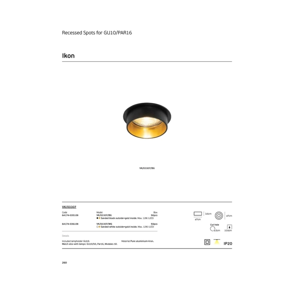 VK/03307/BG Спот за вграждане за GU10/PAR16, Max12W (LED), IP20, ø7x3.6cm, шлифовано черно отвън + златно отвътре... виж повече